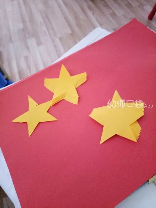 老师提供红色手工纸、剪好的五角星,让孩子直接粘贴制作,但要告诉孩子粘贴的位置,这个很重要哦。