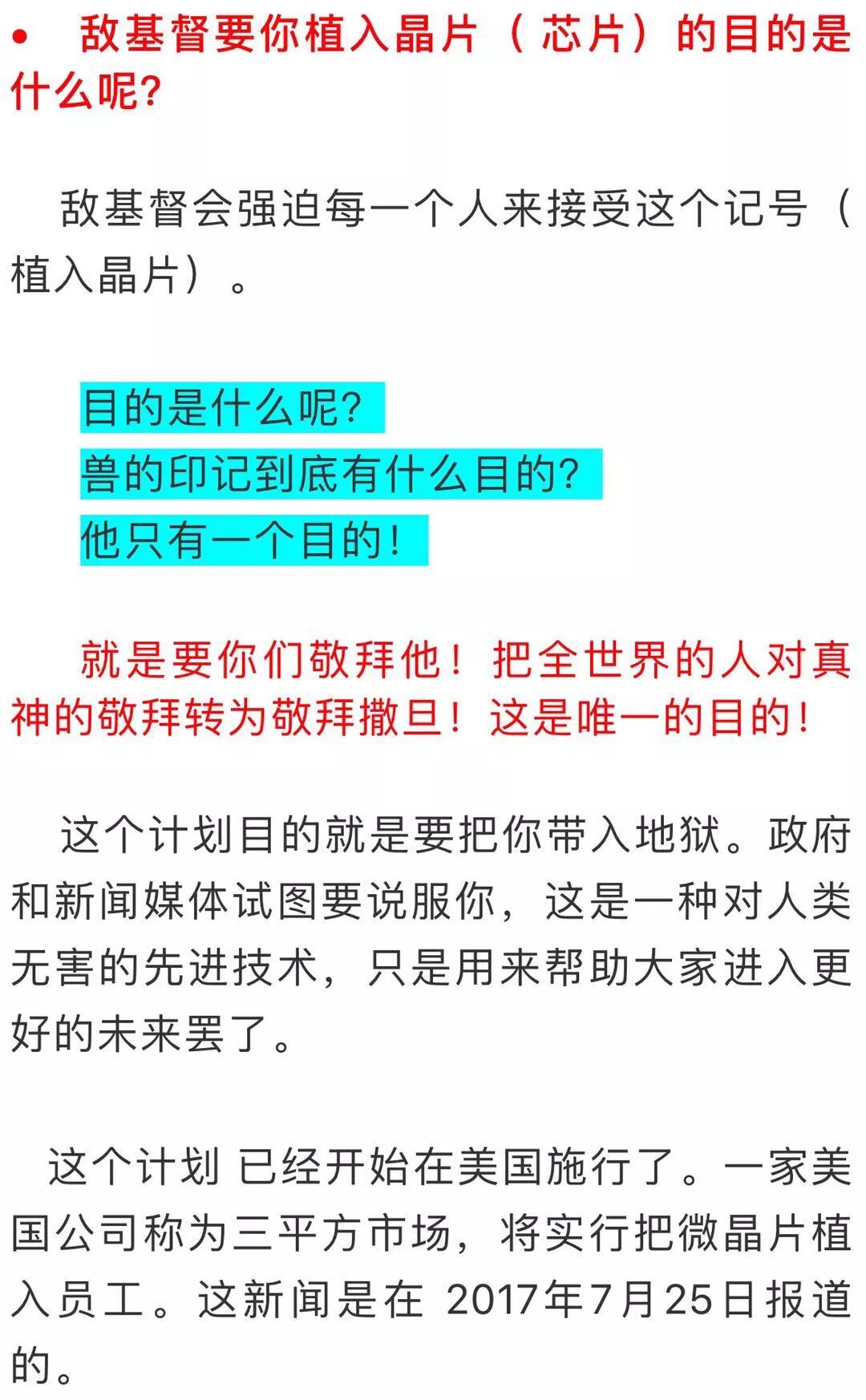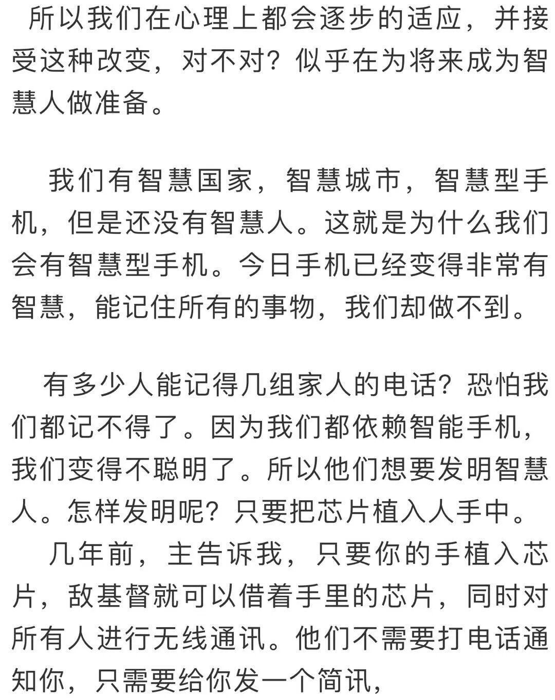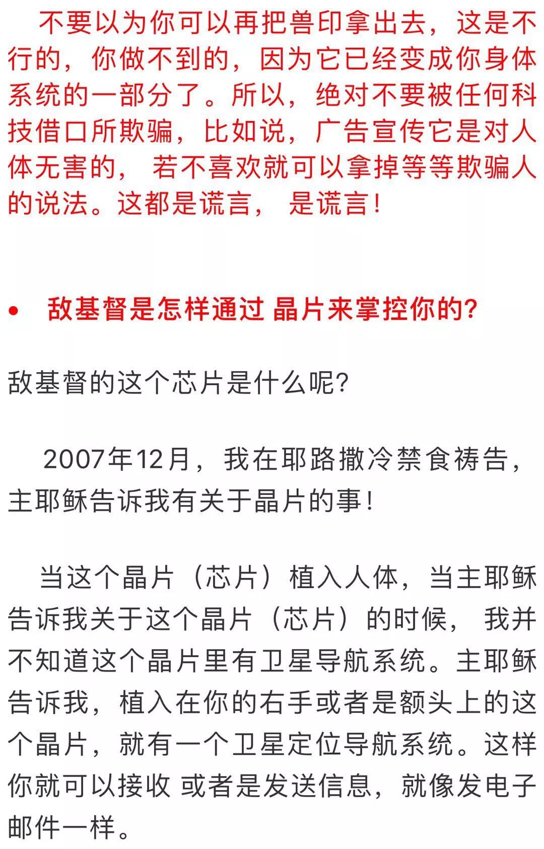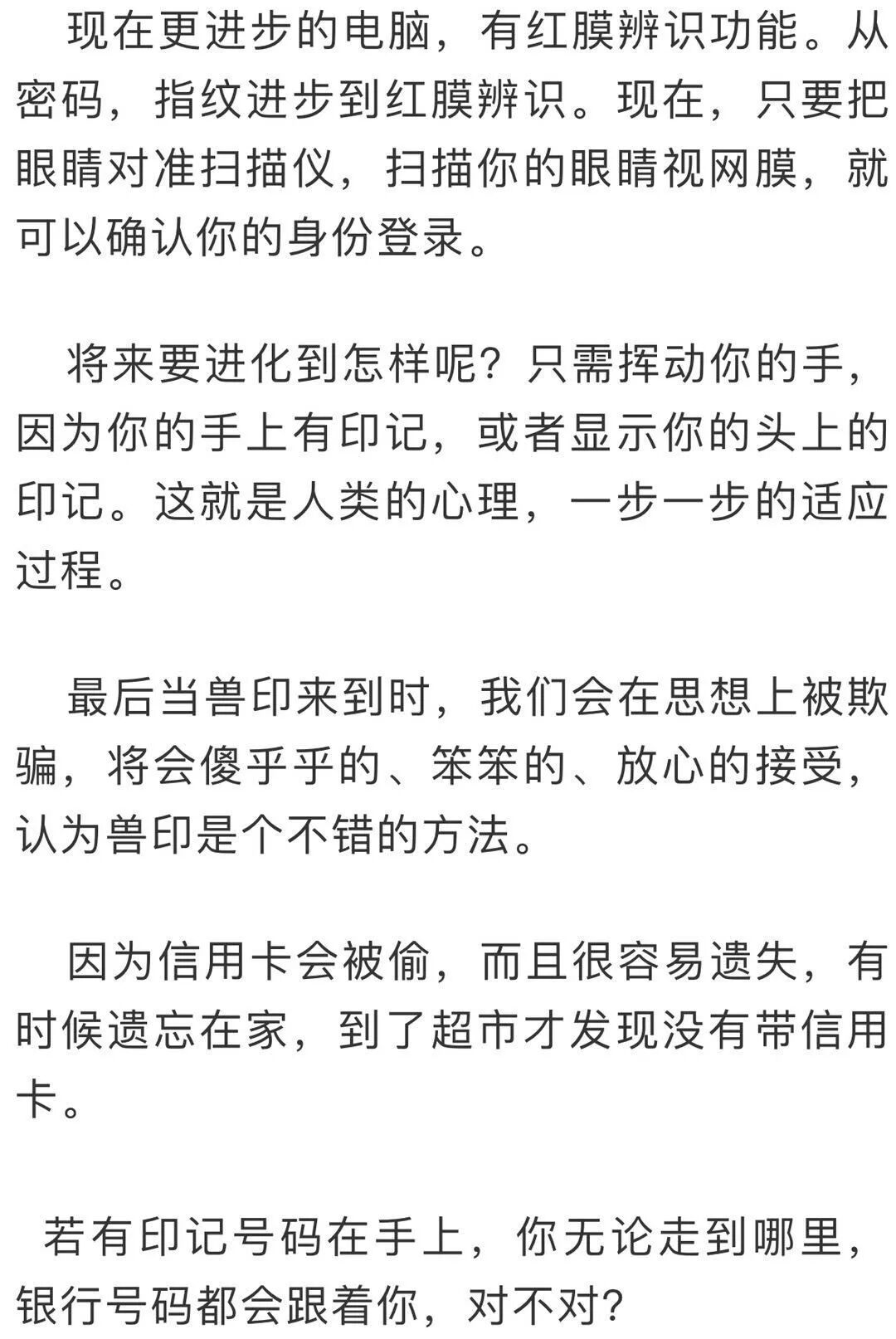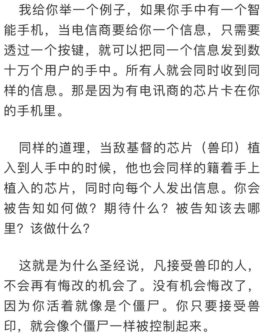 我们必须认识到圣经里启示录所提到的兽印技术,现在已经准备好了,也正在进行当中。这正是启示录在2000年前就已经预言了的兽印警告。