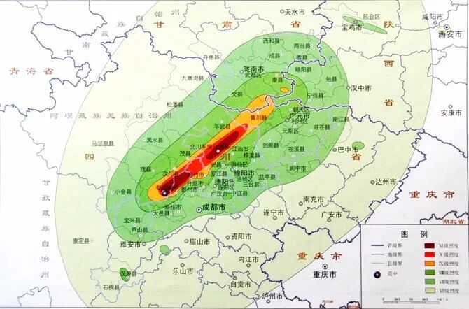 汶川地震中的震中烈度高达11度,震中50千米范围内的县城,200千米范围内的大中城市,都有不同程度的震感,比如成都处于7度区,重庆、西安则位于5度区。