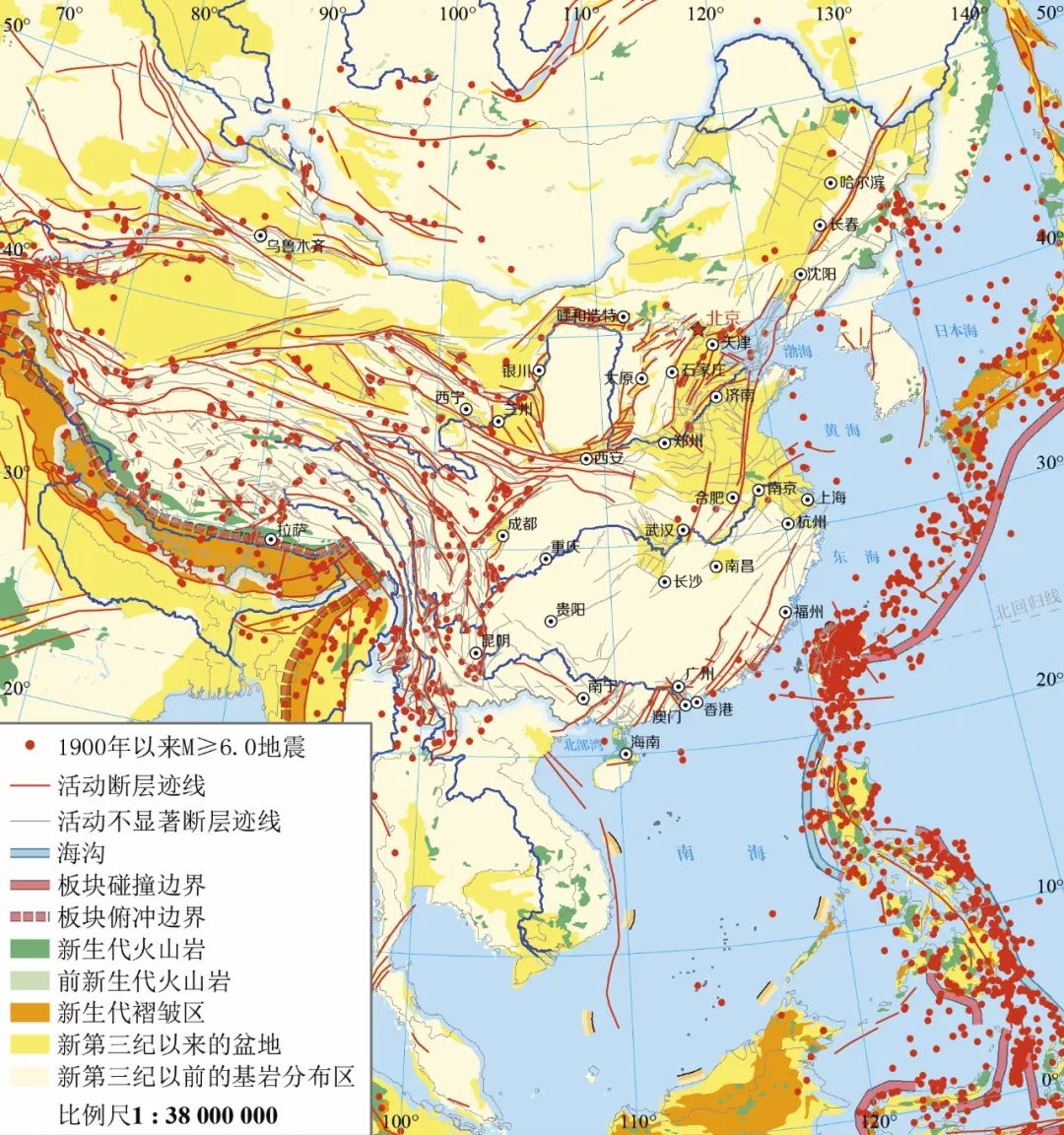 受太平洋板块、印度板块和菲律宾海板块的挤压,再加上欧亚板块深部地球动力作用的影响,第四纪构造活动十分强烈。结果就是那些与地震发生关系最为密切的活动断层(迄今12万年以来曾有活动的断层)遍布了华夏大地。