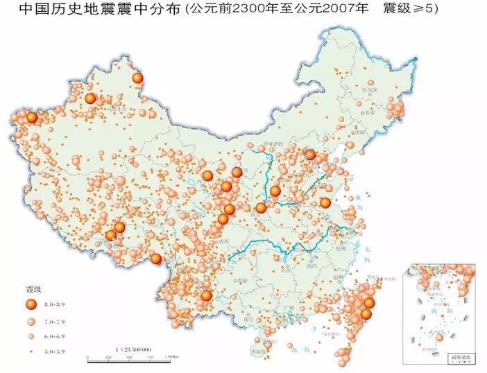 ▲中国历史地震震中分布(公元前2300年至公元2007年 震级≥5)