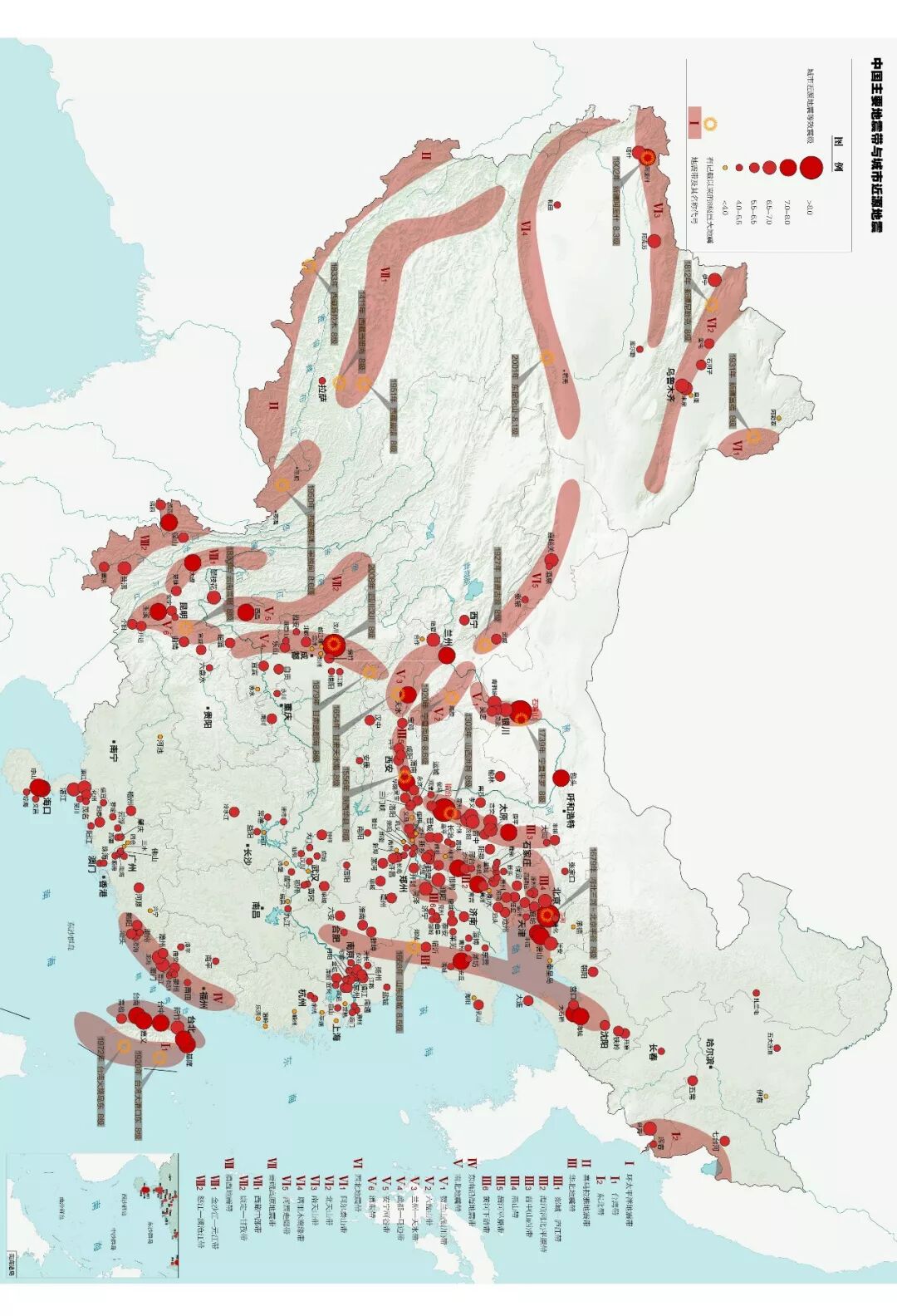 其次,我们给出了《中国城市近源地震等效震级分类图》,数据来源于《中国城市地震灾害危险度评价》(作者:北京师范大学环境演变与自然灾害教育部重点实验室徐伟、王静爱、史培军、周俊华)。在研究中,上述学者参照国际惯例,把以城市为中心、30公里为半径的范围内发生的地震定义为城市近源地震。他们采集、分析了截至2000年共约4300年间、涉及672个城市的地震信息6759条,结果表明,曾经发生过等效6.5级以上近源地震的城市主要集中在华北地区、东南沿海、西北地区和西南地区,而这些城市大多位于我国主要的地震带上。发生过中强级别近源地震的城市,其下方存在着潜在震源,在抗震设防时应予以特别重视。