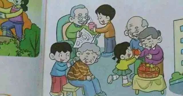 今天,同学们到敬老院看望孤寡老人。小明正在给老爷爷捶背,小方正在给老爷爷倒茶,小红正把一个又大又红的苹果送到老奶奶的手里。爷爷奶奶和小朋友们都高兴极了!