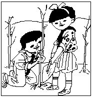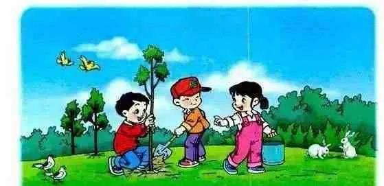 植树节来了,老师带领同学到山上植树,为祖国绿化荒山,大家可高兴了。你看,小东扶着小树,兰兰培土,他们干得多认真呀。