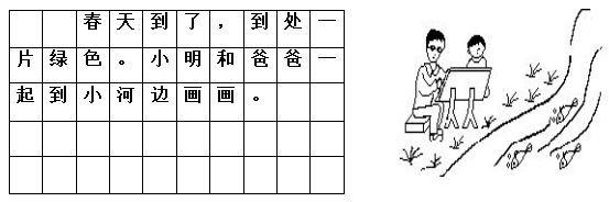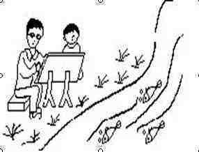 星期天,爸爸带着明明到河边去画画,爸爸画河流,画花草,还画水中的鱼儿。爸爸画的画好美啊!