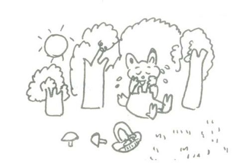 一天,小兔高高兴兴地到树林里采蘑菇。一不小心摔了一跤,篮子里的蘑菇满地乱跑。小兔伤心地哭了。