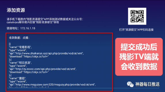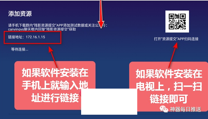 如果「残影影视TV115」安装在电视上,需要打开手机上安装的「残影资源提交」APP进行扫描一下进行链接;这样操作更快捷方便一些。