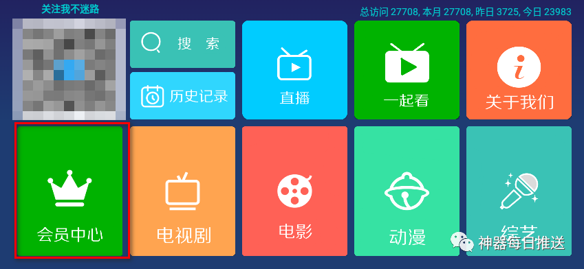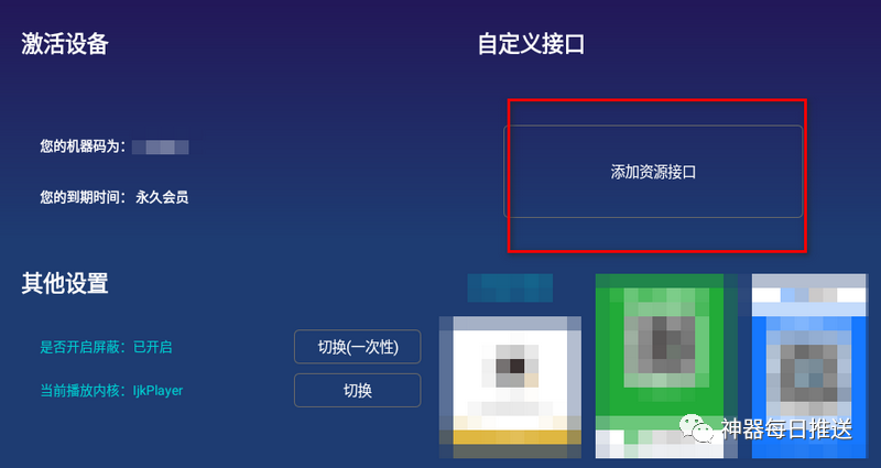 2、在电视上安装好「残影影视TV115」版之后,如下图所示,找到「会员中心」打开,然后找到「添加资源接口」按照文字提示操作;