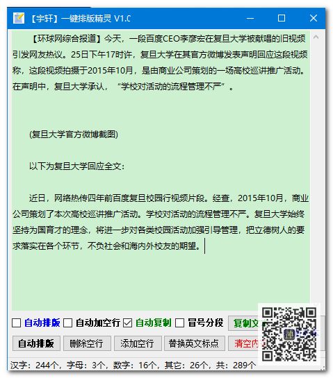 “rickv”开发的这款一键排版工具比“天若幽心”大神开发的那款排版工具多了一些功能,比如自动加空行、自动复制、冒号分段、删除与添加空行、替换英文标点,以及自动统计文字、字母、数字等功能。