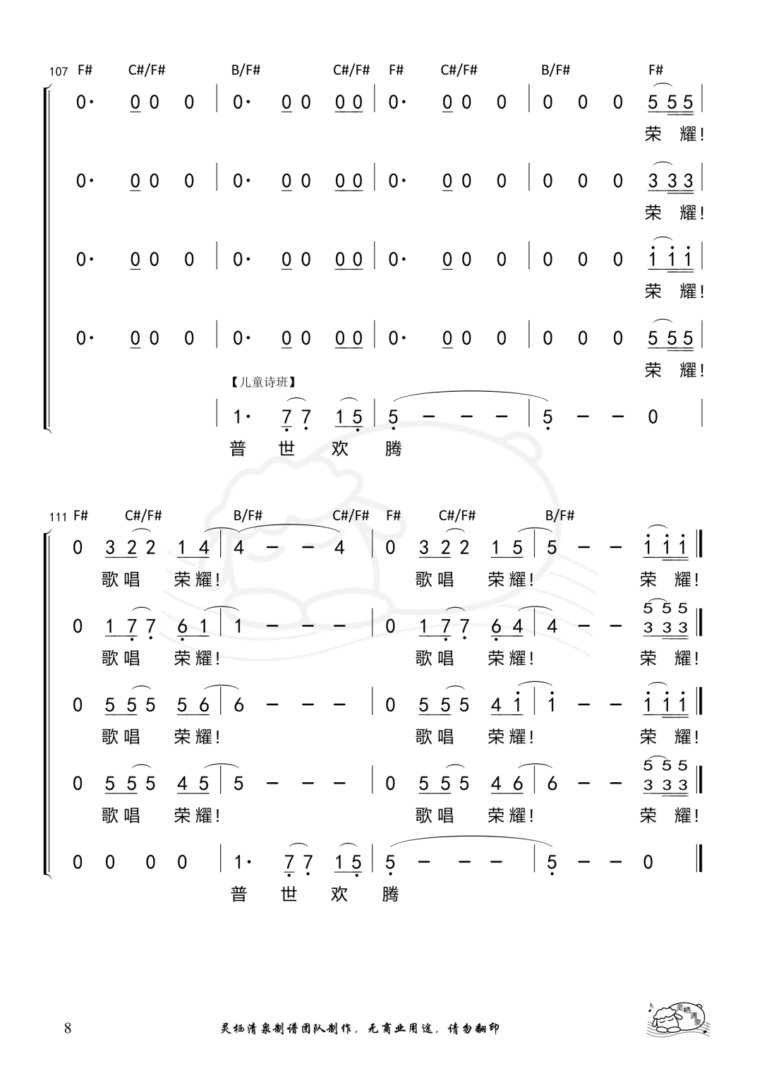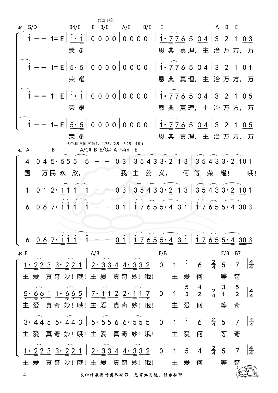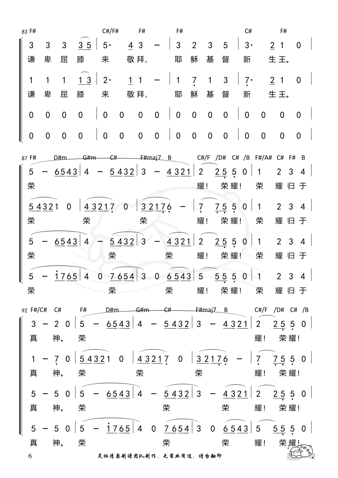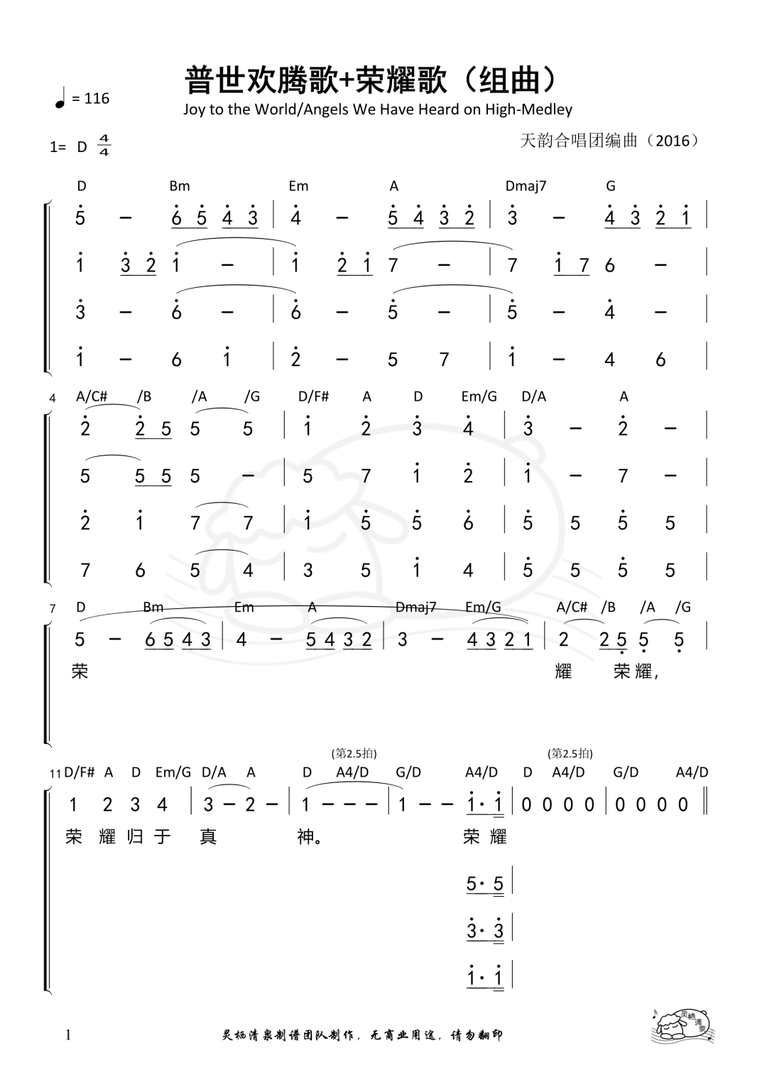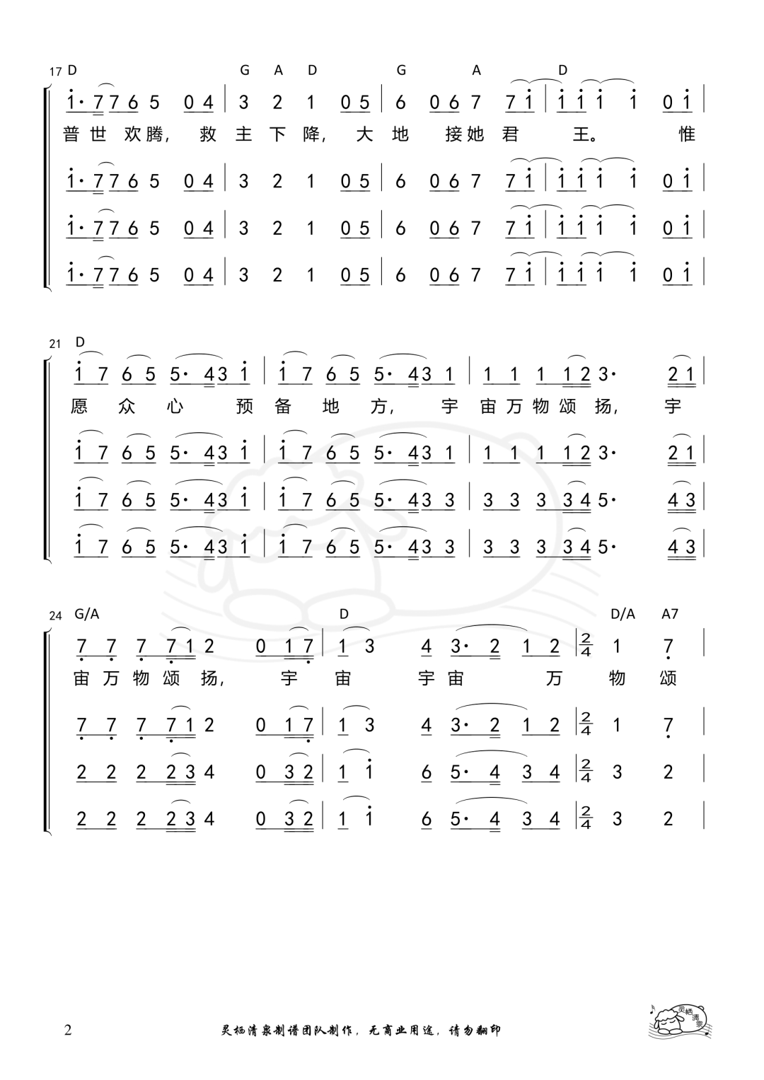 普世欢腾救主下降 大地接她君王 惟愿众心预备地方 宇宙万物颂扬 宇宙万物颂扬 宇宙宇宙万物颂扬 普世欢腾主治万方 民众都当歌唱 田野江河山岭平原 响应歌声嘹喨 响应歌声嘹喨 响应响应歌声嘹喨 荣耀 恩典真理主治万方 万国万民欢欣 我主公义何等荣耀 哦!主爱真奇妙 哦!主爱真奇妙 哦!主爱何等奇妙 歌唱荣耀,歌唱荣耀 天使在高天歌唱 甜美声音在人间 高山群岭齐响应 喜乐佳音响不停 荣耀、荣耀归与真神 荣耀、荣耀归与真神 请来到伯利恆城 圣子耶稣已降生 谦卑屈膝来敬拜 耶稣基督新生王 荣耀、荣耀归与真神 荣耀、荣耀归与真神 荣耀、歌唱荣耀,歌唱荣耀,荣耀 普世欢腾 荣耀、歌唱荣耀 普世欢腾,歌唱荣耀,荣耀!