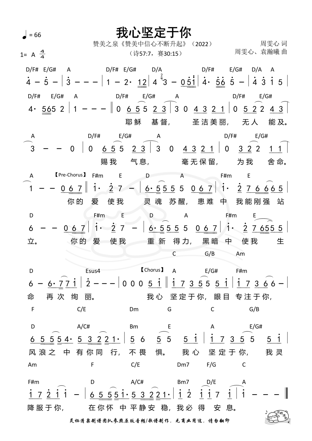 我心坚定于你 My Heart's Steadfast On You 词:周雯心 Joan Chou 曲:周雯心 Joan Chou、袁瀚曦 Lambert Yuen © 2022 Stream of Praise Music / BMI. CCLI 7197684 中文: [Verse] 耶稣基督 圣洁美丽 无人能及 赐我气息 毫无保留 为我捨命 [Pre-chorus] 你的爱使我灵魂苏醒 患难中 我能刚强站立 你的爱使我重新得力 黑暗中使我生命再次绚丽 [Chorus] 我心坚定于你 眼目专注于你 风浪之中 有你同行 不畏惧 我心坚定于你 我灵降服于你 在你怀中 平静安稳 我必得安息