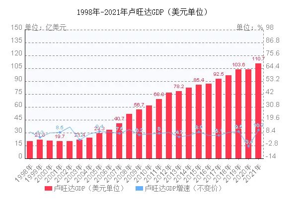 卡加梅担任总统期间,卢旺达的经济有了高速增长(当然也因为基数低),过去20年,卢旺达的年均GDP增长8%,人均GDP由2000年的254美元,上升到2021年822美元。