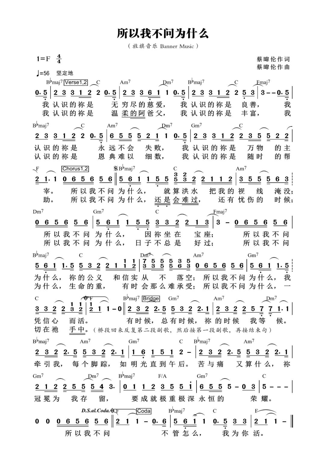 Verse1 我认识的你是 无穷尽的慈爱 我认识的你是 良善 我认识的你是 永远不会失败 我认识的你是 万物的主宰 Chorus1 所以我不问为什麽 就算洪水 把我的视线淹没 所以我不问为什麽 因你坐在宝座 所以我不问为什麽 你的公义 和信实从不落空 所以我不问为什麽 我凭信心而活 Verse2 我认识的你是 温柔的阿爸父 我认识的你是 丰富 我认识的你是 恩典难以细数 我认识的你是 随时的帮助 Chorus2 所以我不问为什麽 还是会难过 还有忧伤的时候 所以我不问为什麽 日子不总是好过 所以我不问为什麽 生命的重 有时会那麽难承受 所以我不问为什麽 一切在他手中 Bridge 有时候 总有时候 你的时候 我等候 牵引我 每个脚踪 如明光 直到午后 苦与痛 又算什麽 你冠冕为我存留 要成就极重极深 永恒的 荣耀
