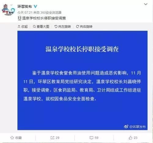 12日上午,针对“山东威海环翠区温泉学校存在食用油安全问题”一事,山东省威海市环翠区人民政府新闻办公室官方微博发布通报称,该校校长刘昌晓停职,接受调查,且自11月12日起,环翠区政府将全面开展校园食品安全风险隐患排查整治。
